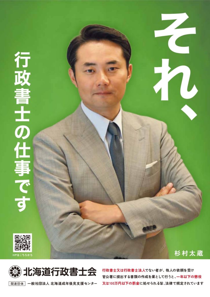 ポスターのモデルは今年度本会新春セミナー講師においでいただいた杉村太蔵氏です。道内各振興局、警察署、保健所等の申請受付窓口に掲示される。