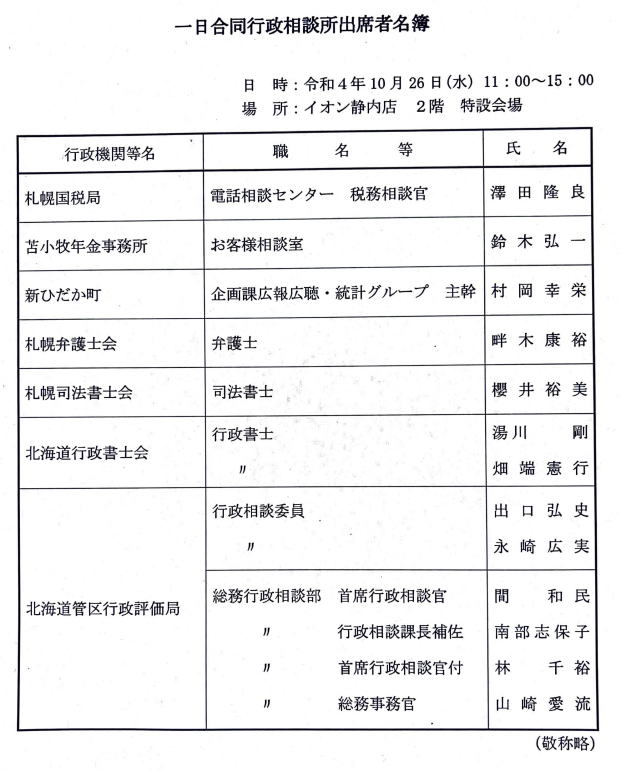 | 総務省北海道管区行政評価局による一日合同行政相談所 | R04.10.26(水)11:00~15:00 | 新ひだか町 イオン | 畑端・湯川理事対応 参加士業等 札幌国税局 日本年金機構 新ひだか町 札幌弁護士会 札幌司法書士会 北海道行政書士会 北海道管区行政評価局 |