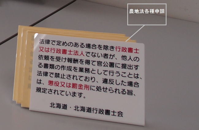 | 現在の道会製作のL型看板 B5版相当 日高管内は7町の農業委員会中、5町7枚設置済み 内訳は(日高町[旧日高]・平取町・日高町[旧門別]・新冠・新ひだか町[旧静内・旧三石]・浦河) 残る2町は様似・えりもはH31設置予定 ![]() なお、このL型看板は 日高振興局建設指導課 及び 経営規模等評価申請書(経審)の移動審査窓口 にも設置されております。 ![]() |