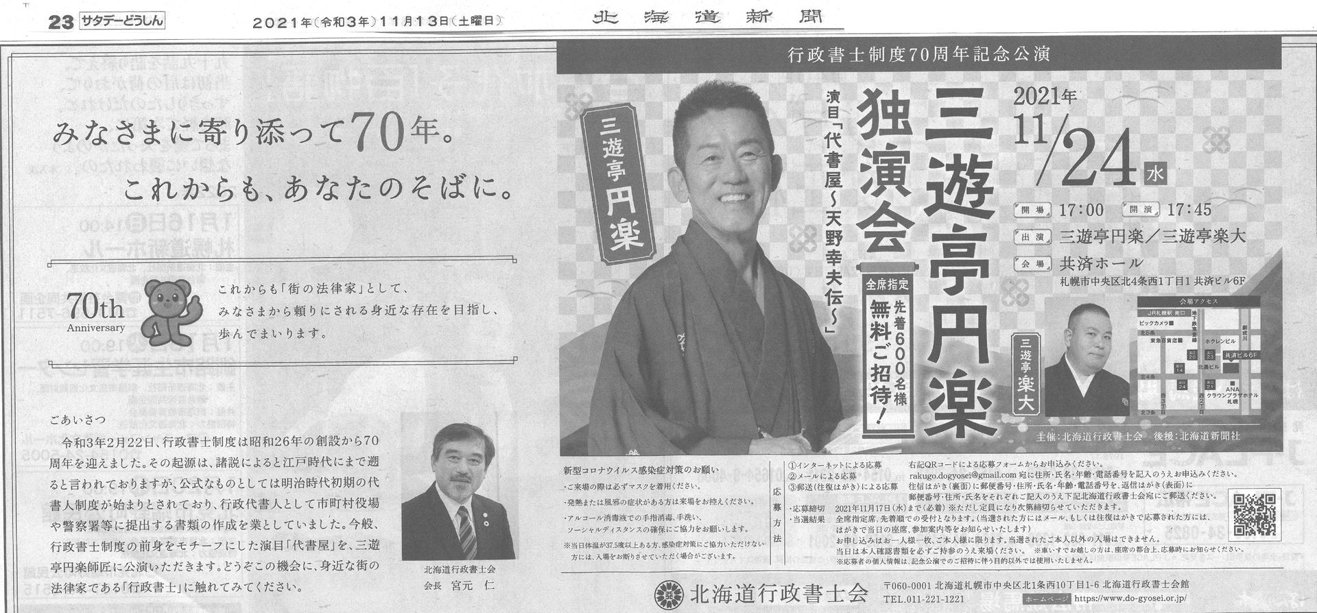 | 同上 道会における70周年記念事業 | R3.11.24(木)17:45 | 共済ホール(札幌市中央区北4条西1丁目1 共済ビル6F) |