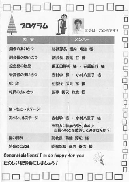 ![]() ![]() ![]() エレベータ前にて参加者をお出迎え 心が伝わります ![]() ![]() 宮元副会長挨拶 ![]() 記念品贈呈 ![]() ![]() ![]() ![]() 乾杯あいさつ ![]() ![]() ![]() ![]() ケーキはママからの差し入れ? ![]() ![]() ![]() 深貝先生お祝いの言葉 ![]() ![]() ママのピアノは ぴか一 ![]() 料理も満足 ![]() ![]() ![]() スタッフも多芸 ![]() ![]() ![]() ![]() ![]() ダスティンホフマンになれなかったよ と歌います ![]() 乱れ髪 上手でした ![]() ![]() ![]() ![]() 銀座の恋の物語 で幕となります おめでとうございました みなさまご苦労様でした |